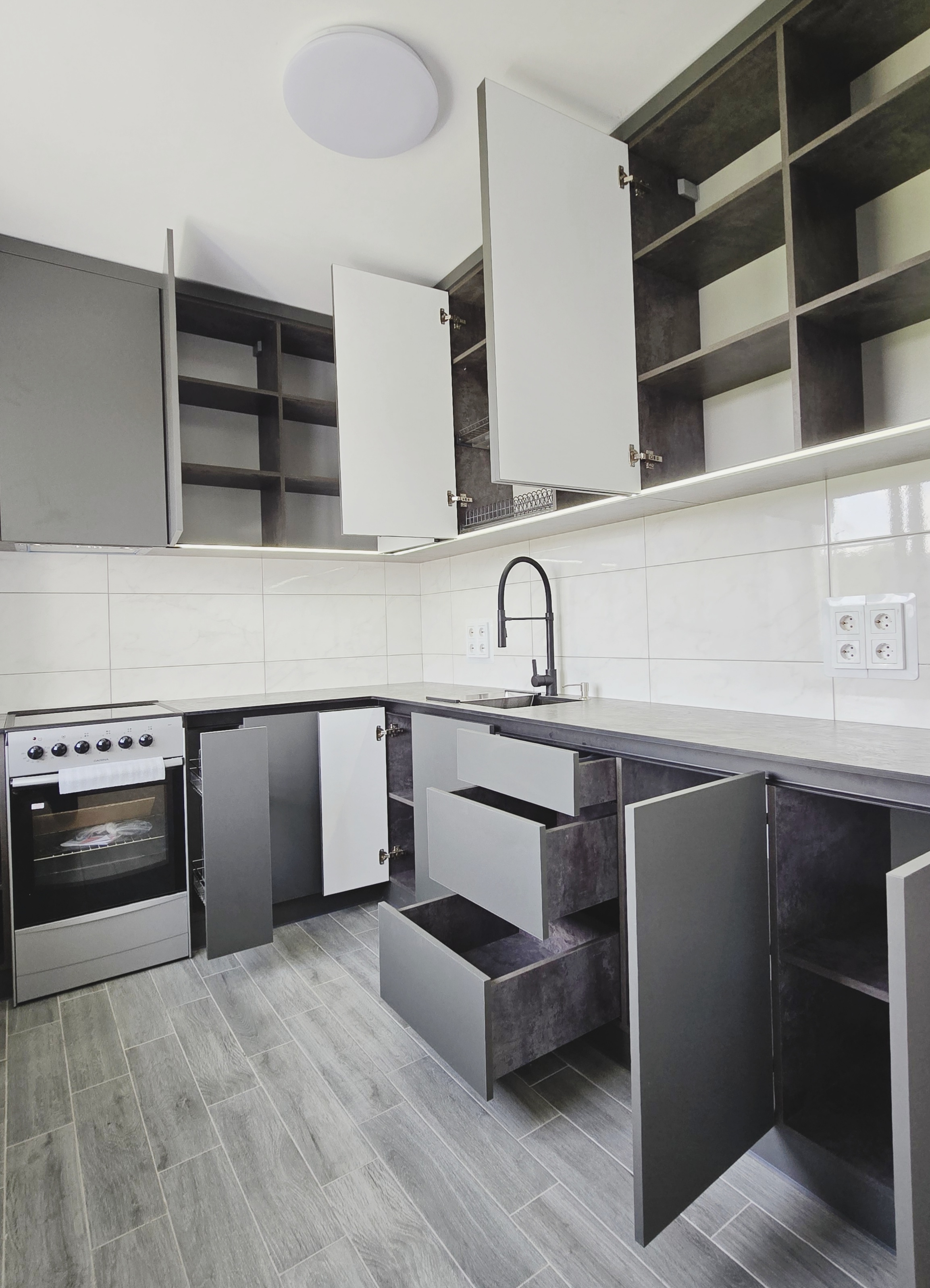 Скрытые ручки Gola установлены по нижним шкафам, а также скрытая ручка по верхним шкафам, дополнительно защищает торец дна шкафов и в ручку встроена подсветка светодиодная сенсорная освещает рабочую зону.